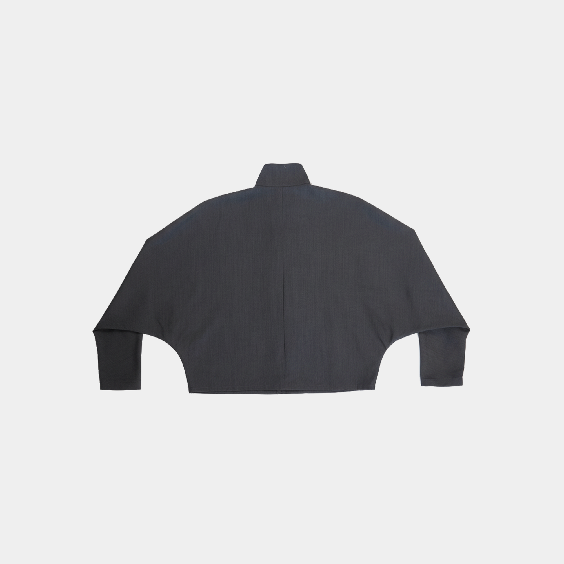 Blusa manga murciélago, con detalle de pliegue en la manga. Cuello alto con estructura, botones ocultos por tapeta.