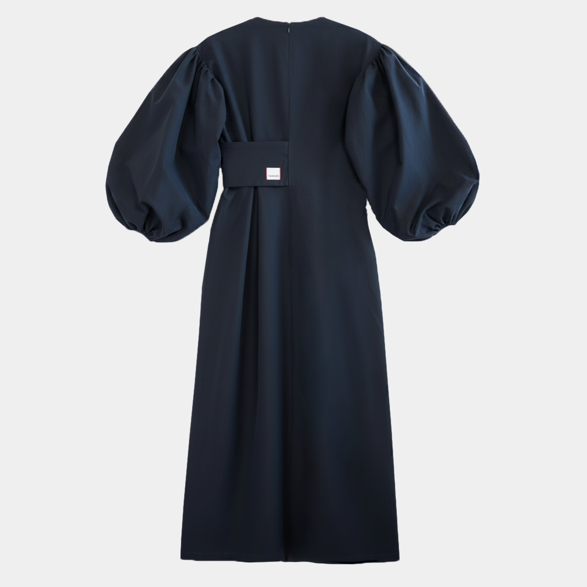 Manga larga tipo globo con gran volumen, fruncidas en la copa y en el puño mediante elástico.